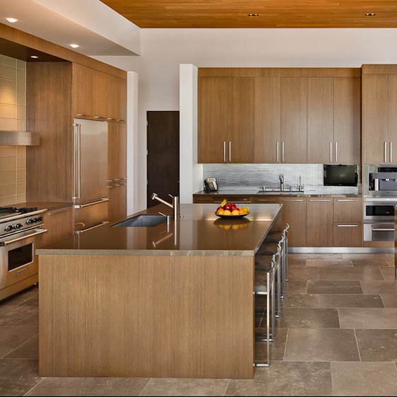 The flat slab design of these doors can be used as a canvas to emphasize the beautiful colors and grain patterns of wood veneers. A modern kitchen featuring Aries cabinet doors can be further complemented with stainless steel appliances, handle-less cabinets, and a monochromatic color palette for a cutting-edge look.