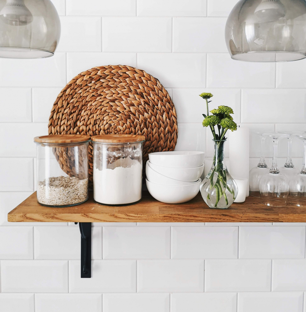 The little touches you can add when decorating your open shelves will really help your overall theme pop, too. Let’s say you are aiming for a more rustic vibe—you can use reclaimed wood shelving and pick containers, baskets, and other organizing vessels that sell the feel you’re going for, like wicker baskets. If your kitchen has a more modern feel, you can opt for decorative organizers with cleaner lines, like glass and steel tins.