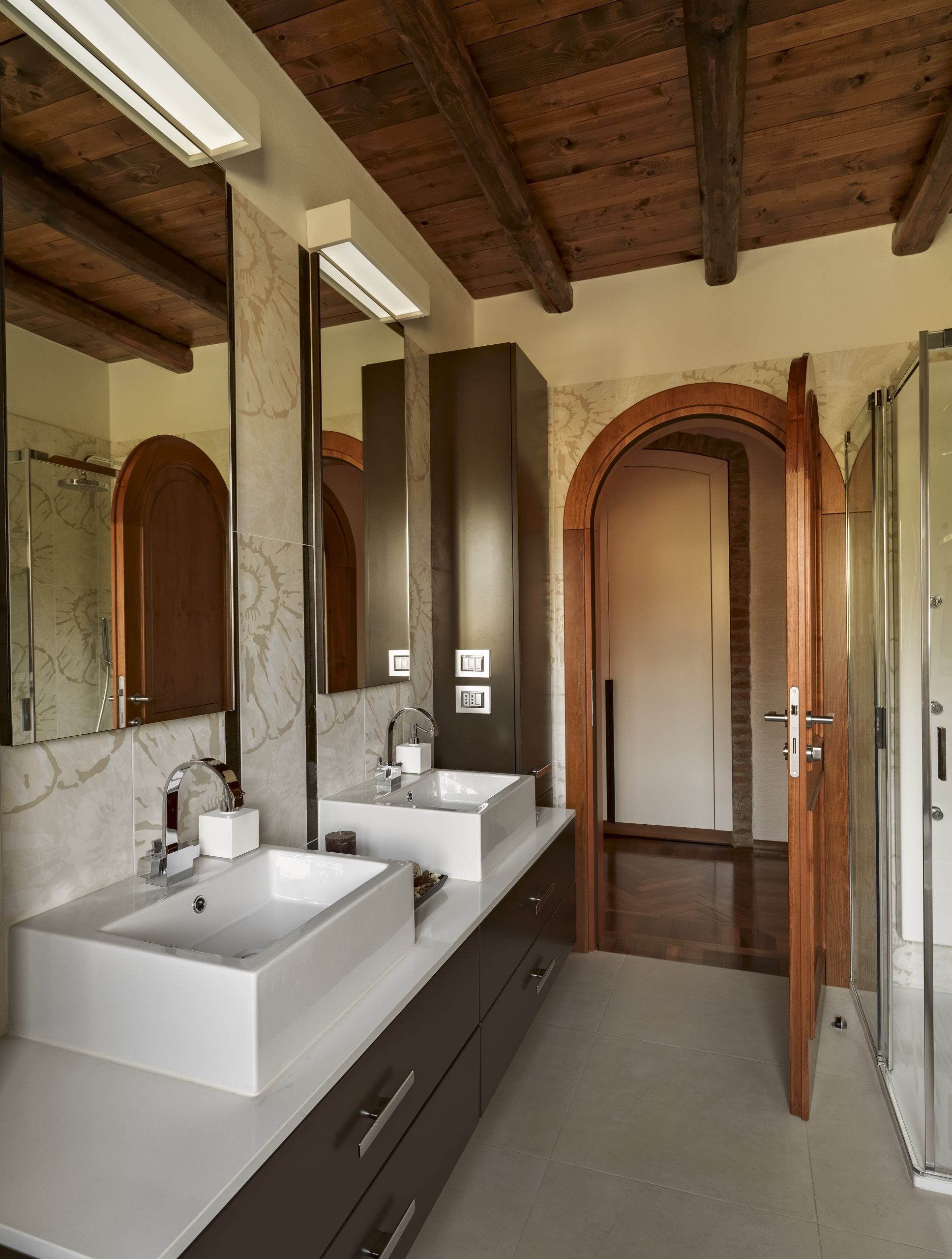 Remember that you are looking to achieve a warm, welcoming, homey space. When it comes to the cabinets in your bathroom, there are several key elements that can help to create the perfect look. First, wood is always a perfect choice for achieving a farmhouse feel. Rough-hewn beams or reclaimed wood cabinets can add instant character to any bathroom. Alternatively, painted cabinets in a light or neutral color can also help to achieve the desired look. You can choose an older-looking style without sacrificing the quality of modern construction as well, achieving the best of both worlds.