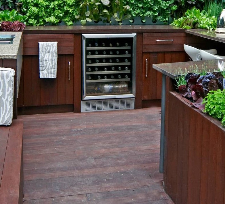 For many, the focal point of the outdoor kitchen is the grilling station–it makes sense, given how naturally grilling and outdoor dining fit together! If warm-weather get-togethers are what you are after with your outdoor kitchen, consider making the grill, stove, or range the star of your kitchen. You might consider something like an island station in the middle of your space, with your grill central to the area. Or, you can opt to maximize your counter space in your outdoor kitchen by putting your cooking appliances in the corner. Wherever you decide your cooking location is going to be, most people build around this area with a wood or stone counter area that serves as the “centerpiece” of the outdoor kitchen, and then build off of that.