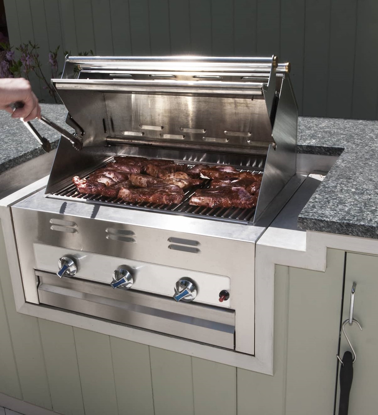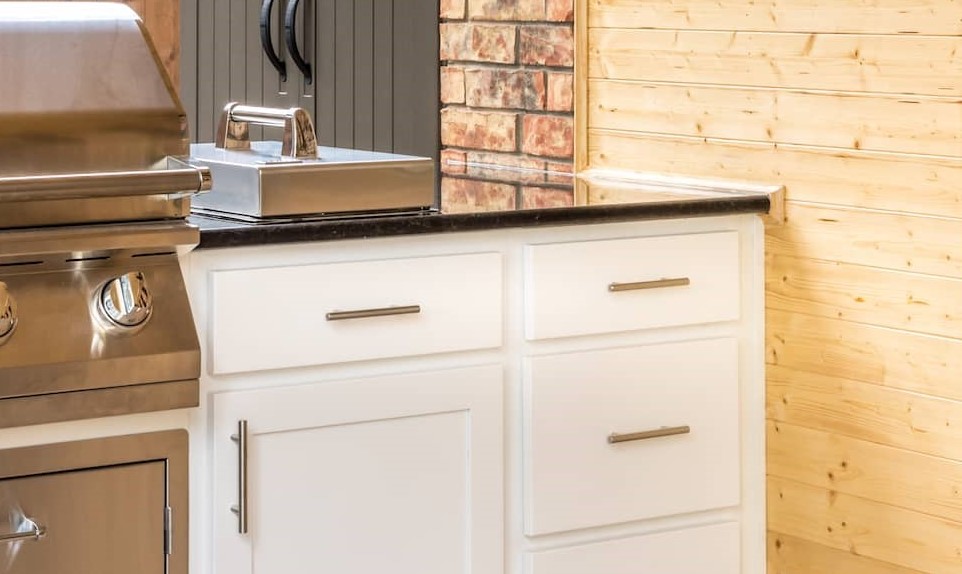 You should also consider the elements that come into play when cooking outside. Unlike cooking indoors, you will have a much better-ventilated grilling area, but you and your guests will also be much more exposed to the heat, sun, wind, insects, and other variables. How comfortable your outdoor diners will be depends on how much shade, seating space, and shielding from the elements–smoke from your grill included–you can provide. You may be limited by what your outdoor space has to offer, too. If you are building your outdoor kitchen under a gazebo or on a deck, you should work to the strengths of your area. Another point to consider is how much you’ll use your outdoor kitchen–if it will get heavy usage, it is well worth your effort and investment to build some outdoor kitchen cabinets for storage. Rather than having to run in and out to your indoor kitchen to grab supplies and dishes, having a specific outdoor set of cooking equipment can be extremely handy, and a set of quality outdoor cabinets is the perfect place for it all. Place settings, canned goods, grilling equipment, cleaning supplies, and more are all prime candidates for storage in your outdoor kitchen cabinets, since they’re all items you’ll want to have handy, but not necessarily out in the open at all times.